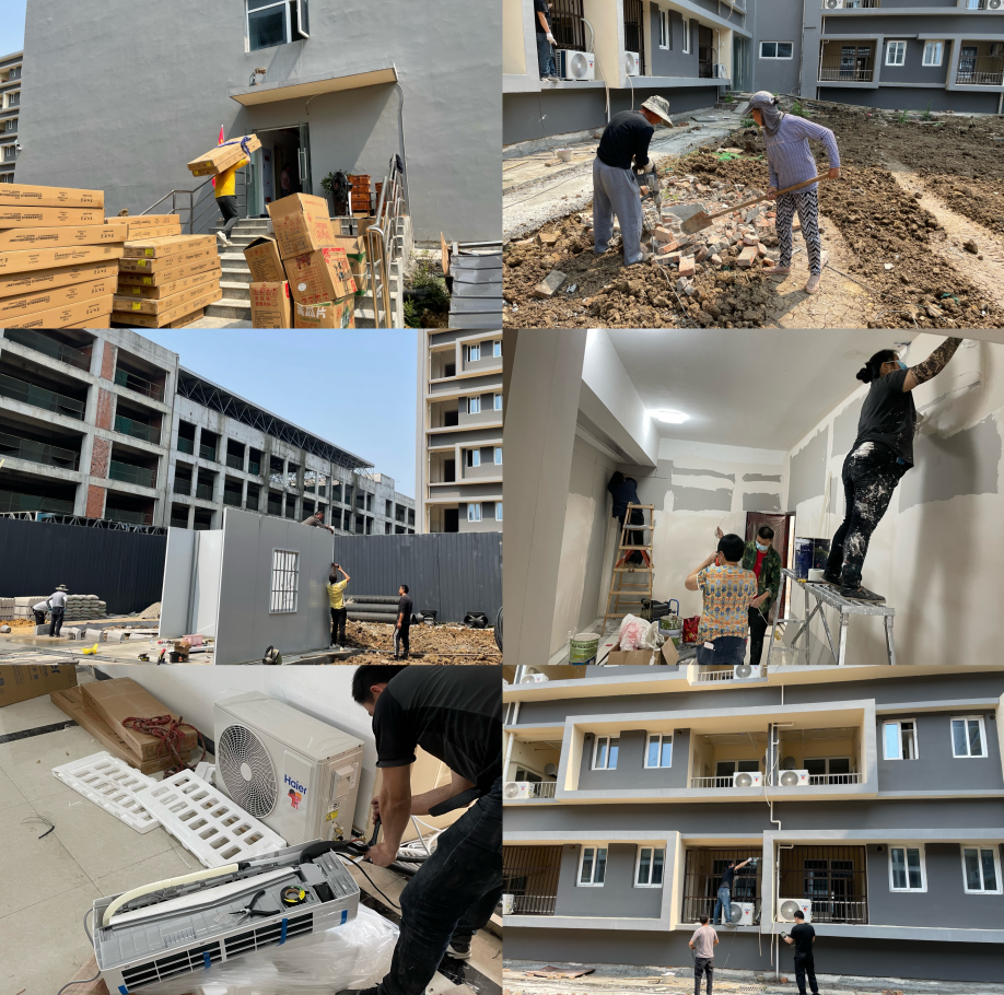 为全面落实区委疫情防控指挥部关于改造储备一批标准隔离场所的工作要求,bw必威西汉姆联官方网站须在较短时间内完成对皓华光电建筑面积8596.74㎡员工宿舍楼约180个房间的标准化改造。面对“时间紧、任务重”的难题,自4月5日接受任务后,bw必威西汉姆联官方网站连夜召开专题会,围绕项目现场实际情况、改造标准要求、任务分段分工、后勤实时保障等进行深入研究,于4月7日迅速入场,开工后合理规划工期,科学分段施工,将室外场平、围栏搭建与室内维修改造、家具电器询价安装同步进行。与此同时,该应急项目成立以集团党员干部带头的“党员突击队”,积极带领业务骨干驻扎项目现场,坚持以安全生产为前提,紧盯项目建设质量、狠抓项目建设工期,“5+2”“白加黑”,以实际行动展现党员模范带头示范作用。截至发稿前,已完成该应急项目室外道路附属设施建设、室内维修改造和家具电器设备安装工程量各60%,预计本月15日按计划完工。