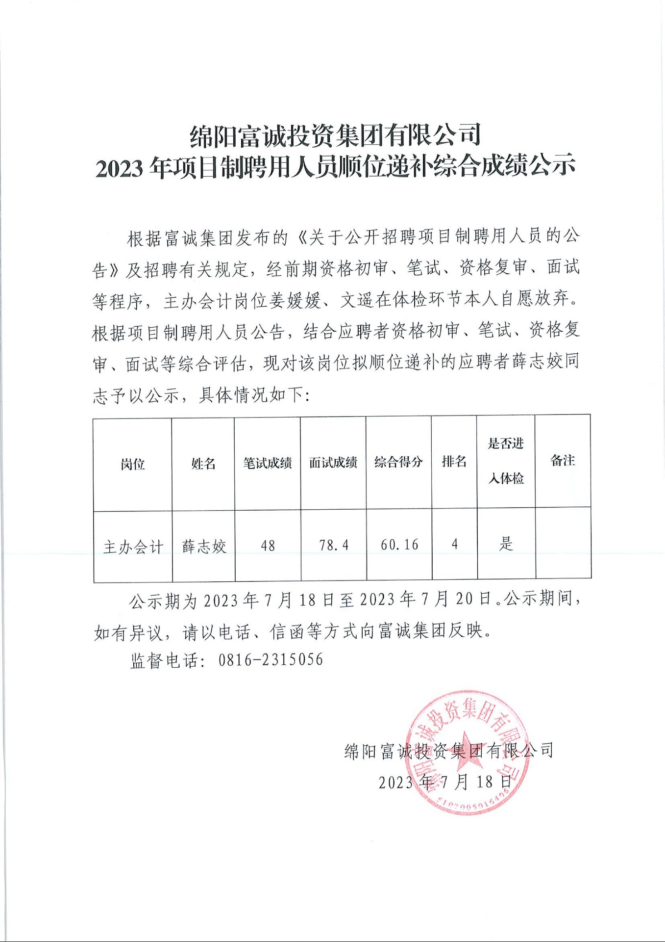 2023年项目制聘用人员顺位递补综合成绩公示