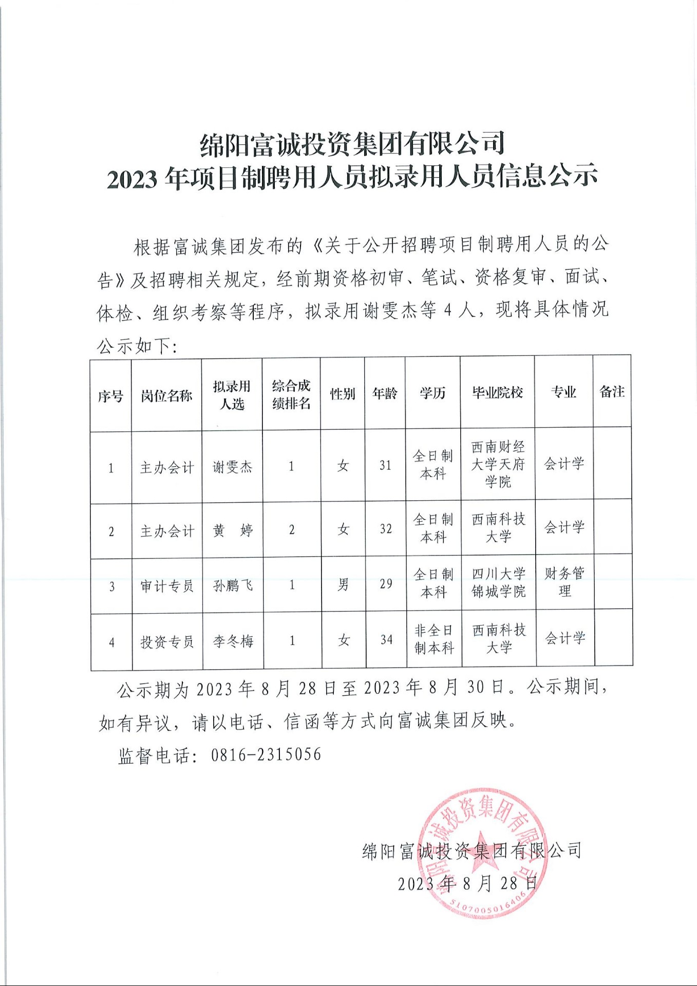 bw必威西汉姆联官方网站2023年项目制聘用人员拟录用人员信息公示