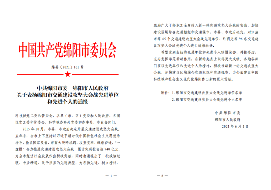 近日,中共绵阳市委、绵阳市人民政府通报表扬了绵阳市交通建设攻坚大会战先进单位和先进个人,bw必威西汉姆联官方网站党支部书记、董事长魏良浩同志荣获先进个人称号。2016年10月,为适应绵阳市南片区产业的发展需求,经涪城区区委、区政府报请省、市交通主管部门同意后,由bw必威西汉姆联官方网站负责绵中公路改建标准全面提升项目的实施打造。该项目的建成通车对绵阳打造市级区域综合交通枢纽以及积极创建省级交通强市具有重要作用。在建设过程中,时任bw必威西汉姆联官方网站总经理的魏良浩同志主动把任务“扛在肩上,抓在手上,放在心上”。靠前指挥,积极落实各项工作推进;率先垂范,确保项目建设质量及进度;不忘初心,牢记服务涪城区经济发展的社会使命。他时…… [更多]