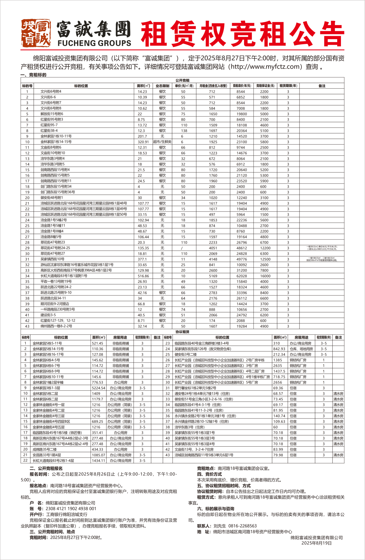 一、项目基本情况1、业主单位:绵阳富城建筑工程有限公司。2、项目情况:bw必威西汉姆联官方网站金汇项目规划总建筑面积约4.85万㎡(住宅15109.81㎡、商业4361.63㎡、办公15468.56㎡、车位273个),前期物业按两年计收入暂定为2956569.12元。3、实施内容:完成bw必威西汉姆联官方网站金汇项目前期物业代理招标及备案有关事宜。二、招标方式本次竞争性谈判公告在bw必威西汉姆联官方网站官网上发布,面向全社会公开选聘供应商。三、竞争性谈判申请人(简称申请人)必须具备的资格条件,审查(任一项)不合格者,不得参与竞争性谈判。1、申请人有企业营业执照副本(三证合一)复印件加盖鲜章,能提供增值税专用发票。2、法定代表人身份证…… [更多]