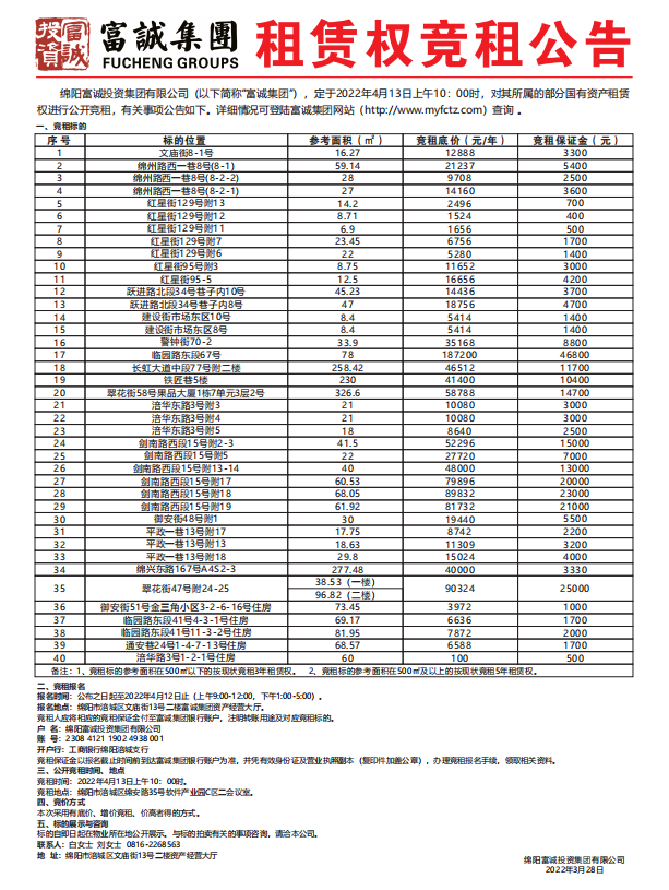 公 告 绵阳富城建筑工程有限公司本次需通过竞争性谈判公开招募御西街延长线(毅兴街)道路建设工程、2020年背街小巷治理元通支路(新庙一路)改造提升工程的造价咨询单位,此次报价采用下浮比例报价方式进行。报名时请提交以下材料:1.申请人有企业营业执照副本(三证合一)复印件加盖鲜章,能提供增值税专用发票。2.法定代表人身份证:法定代表人亲自到场的出示身份证原件,存复印件。若法定代表人不能亲自到场的,被委托人应出具法定代表人授权委托书原件和被委托人的身份证(查验原件,存加盖公司鲜章复印件。法定代表人范本见附件)。&nbs…… [更多]