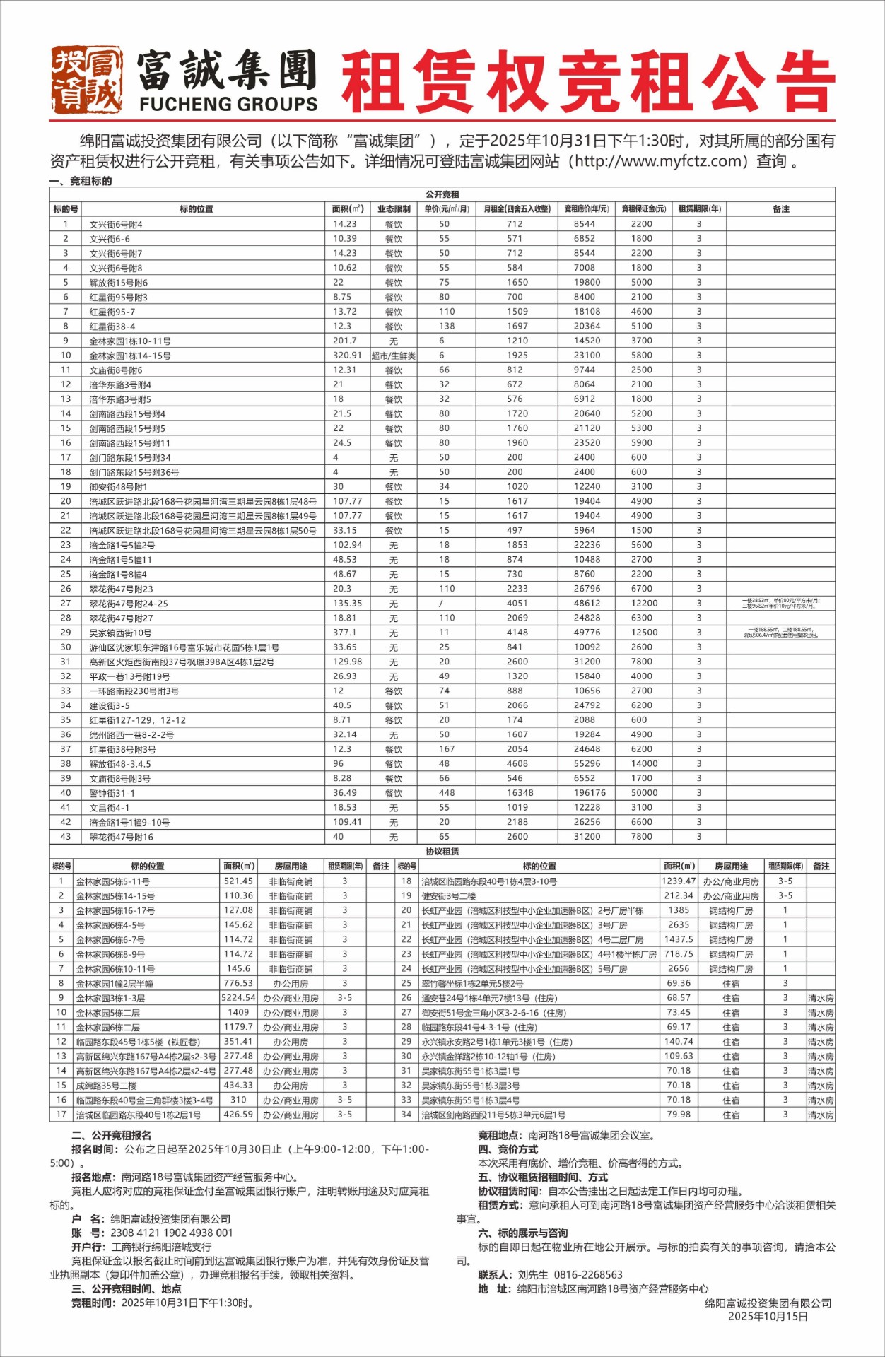 一、项目基本情况1、业主单位:绵阳富城建筑工程有限公司。2、项目名称:bw必威西汉姆联官方网站金汇项目。3、服务地址:涪城区绵安路35号中国(绵阳)科技软件产业园。4、服务内容:bw必威西汉姆联官方网站金汇项目售房部员工服装制作。二、竞争性谈判申请人(简称申请人)必须具备的资格条件,审查(任一项)不合格者,不得参与竞争性谈判。1、申请人需提供有效证照复印件加盖鲜章:企业需提供企业营业执照副本(三证合一)复印件,个体工商户需提供个体工商户营业执照(含统一社会信用代码)复印件,且均需能提供增值税专用发票。2、身份及授权要求:若为企业,法定代表人亲自到场的出示身份证原件,存复印件;法定代表人不能亲自到场的,被委托人应出具法定代表人授权委托…… [更多]